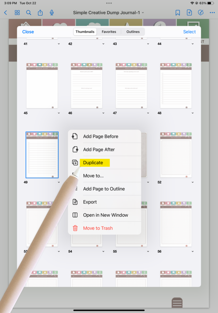 2. Click on the small dropdown carrot and choose Duplicate. Your page will then appear after the original in your journal.